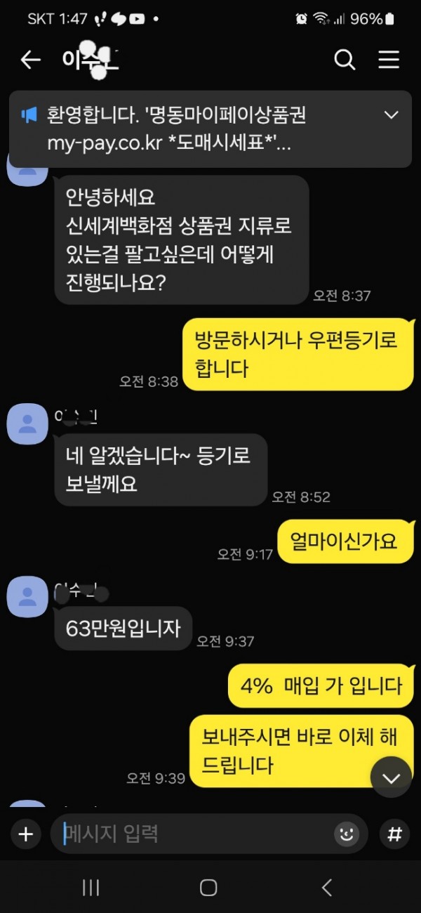 명동마이페이상품권 010-9808-5438 카톡 문자