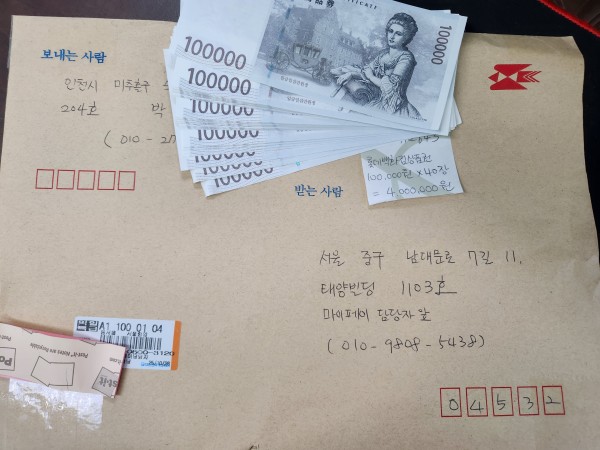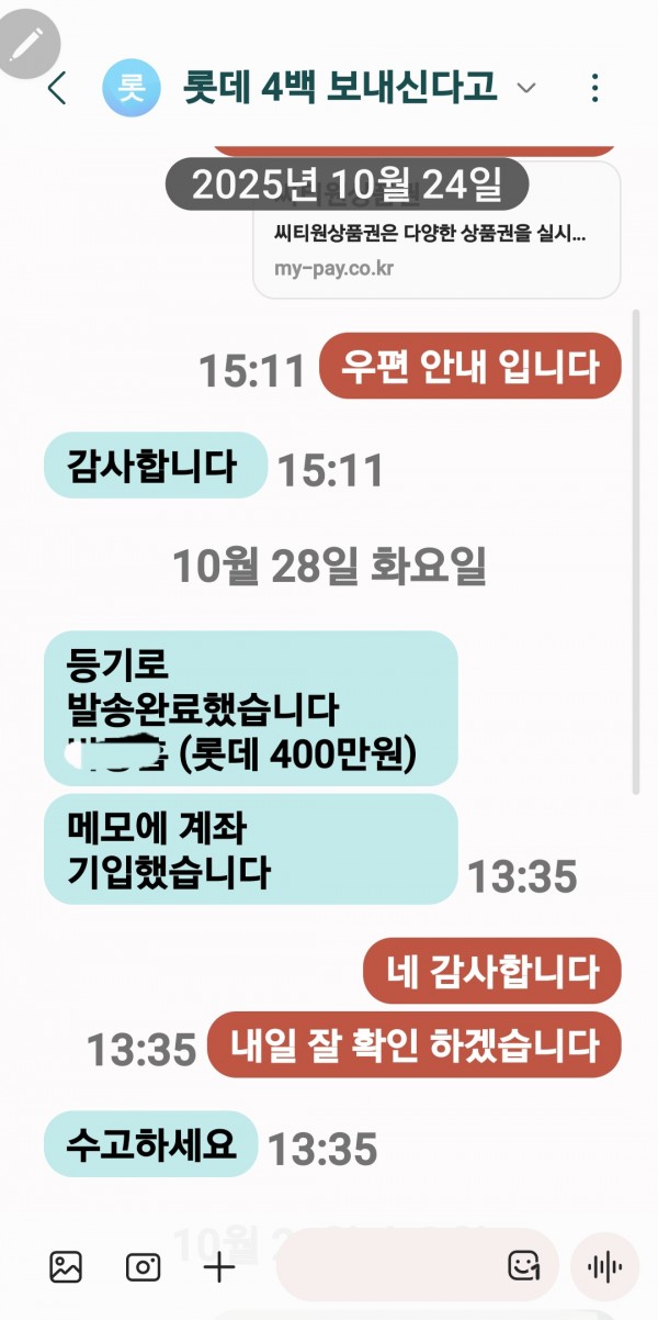 인천시 미추홀구 숙골로 고객님 롯데 4백만원 우체국 등기 거래 완료