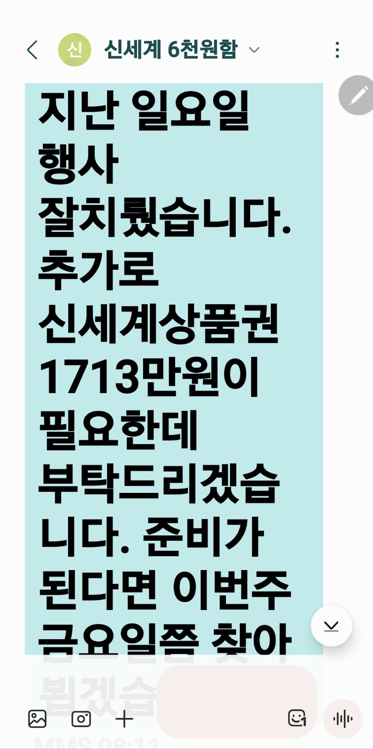 지난주 금요일, 조선팰리스에서 결혼식을 앞두고 신세계상품권을 준비해 가셨던 고객님께서
