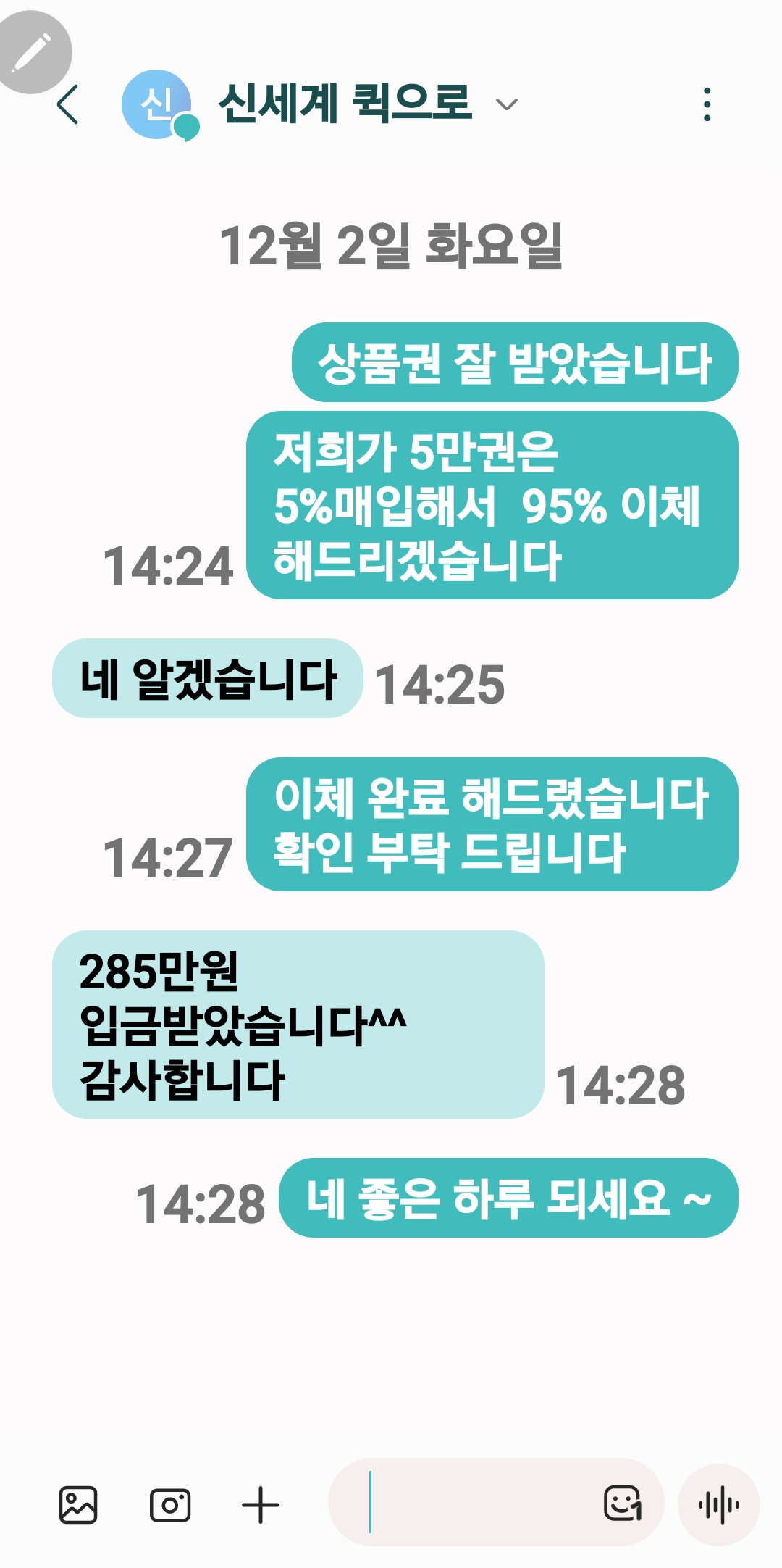 “신세계상품권 300만원 퀵으로 보내드릴게요” 하고 먼저 연락을 주셨습니다.