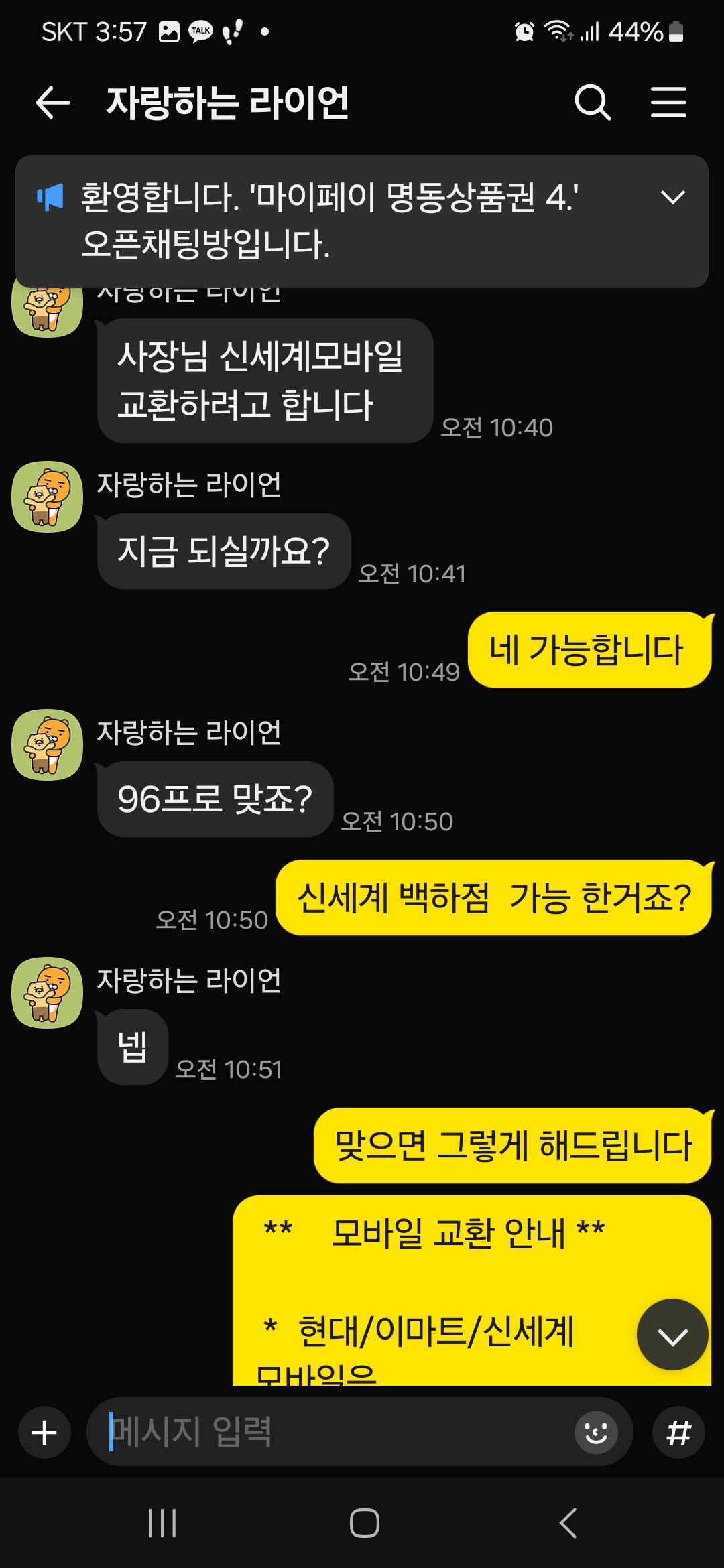 카톡 문의 후 신세계백화점 모바일 상품권 매도 100만원 96% 정산 완료 ( 롯데백화점 모바일 100만원 4% 매입)