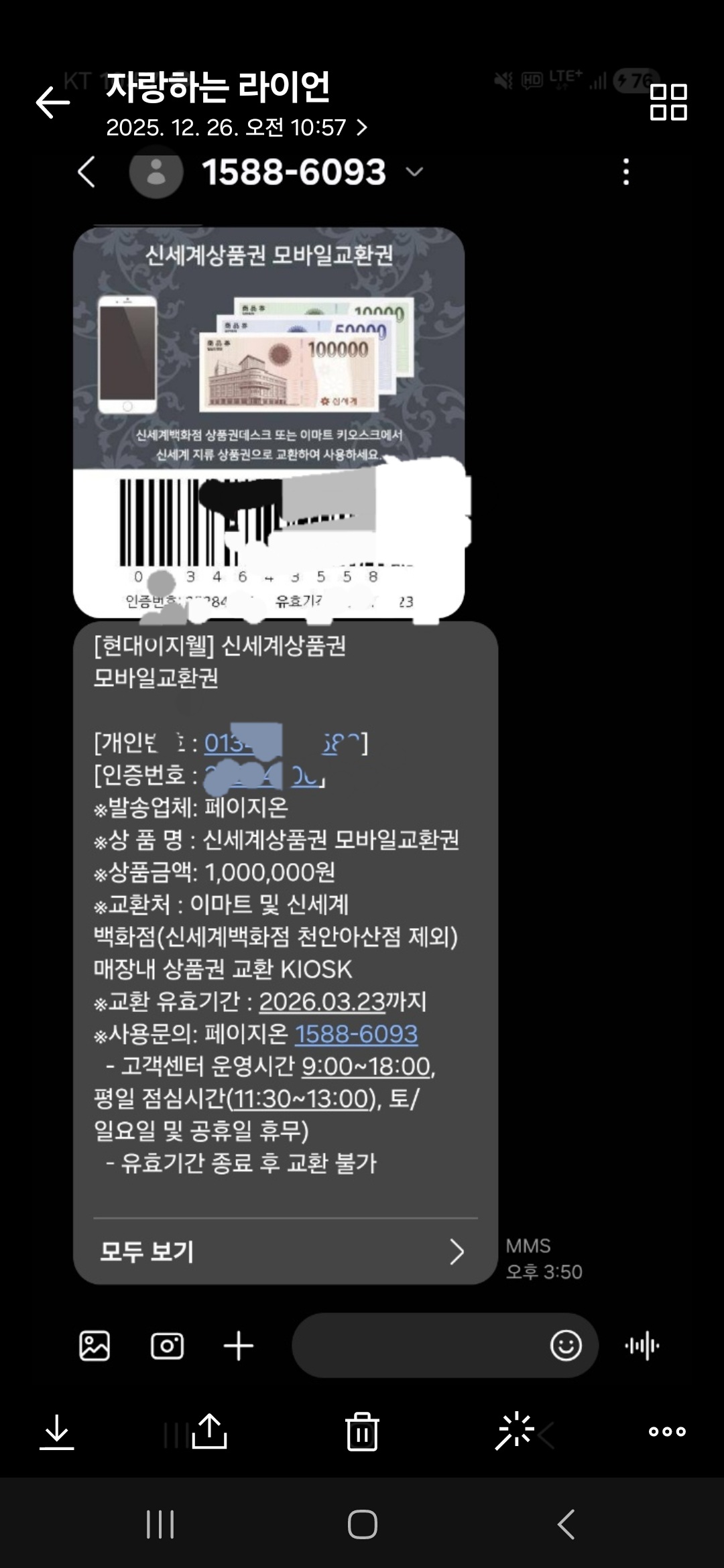 페이지온에서 발급받은 신세계 상품권 모바일 바코드를 전달해 주셔서
